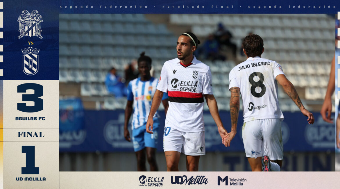 La UD Melilla cae frente al Águilas FC por 3-1. Los locales anotaron antes del descanso y al inicio del segundo tiempo. Chavarría recortó distancias con un golazo de chilena, pero los locales sentenciaron el encuentro en el 89’