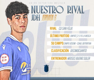 Se enfrentarán al CD San Félix, conjunto ubicado en la decimocuarta posición de la clasificación de liga. Los malagueños tienen los mismos puntos que los melillenses, pero su diferencia de goles hace que estén fuera de las posiciones de descenso. Los felicianos vienen de empatar frente a dos frente a la Mosca. Samuel García y Javier González fueron los goleadores del encuentro.