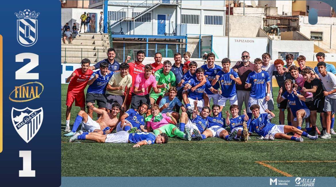 En la segunda parte, el Málaga CF intentó ir para adelante en busca del empate, pero el conjunto unionista se mostraba muy solvente atrás y con la seguridad que daba Jota bajo los palos. A pesar de los intentos visitantes, los melillenses tuvieron incluso la opción de anotar el tercero hasta en dos ocasiones, con un mano a mano de Hugo Pech que despejo el porteo a meta y un tiro de Senso. La escuadra azulina supo aguantar y jugar los minutos finales para llevarse su primera, y merecida, victoria de la temporada.